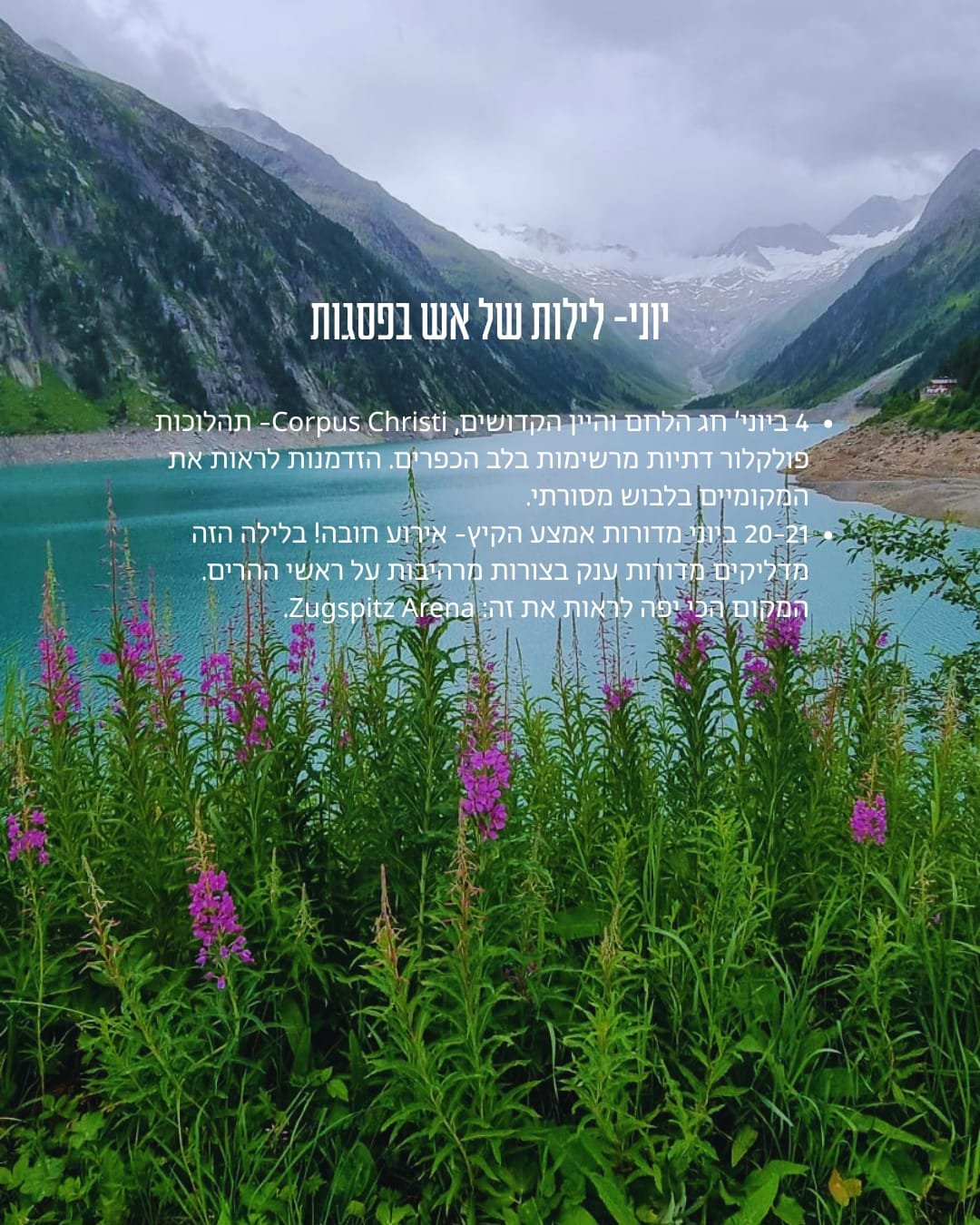 20-21 ביוני:מדורות אמצע הקיץ Solstice Bonfires. אירוע חובה בכל טירול ובפרט בעמק אוץ – הדלקת מדורות ענק בצורת סמלים על פסגות ההרים בלילה.